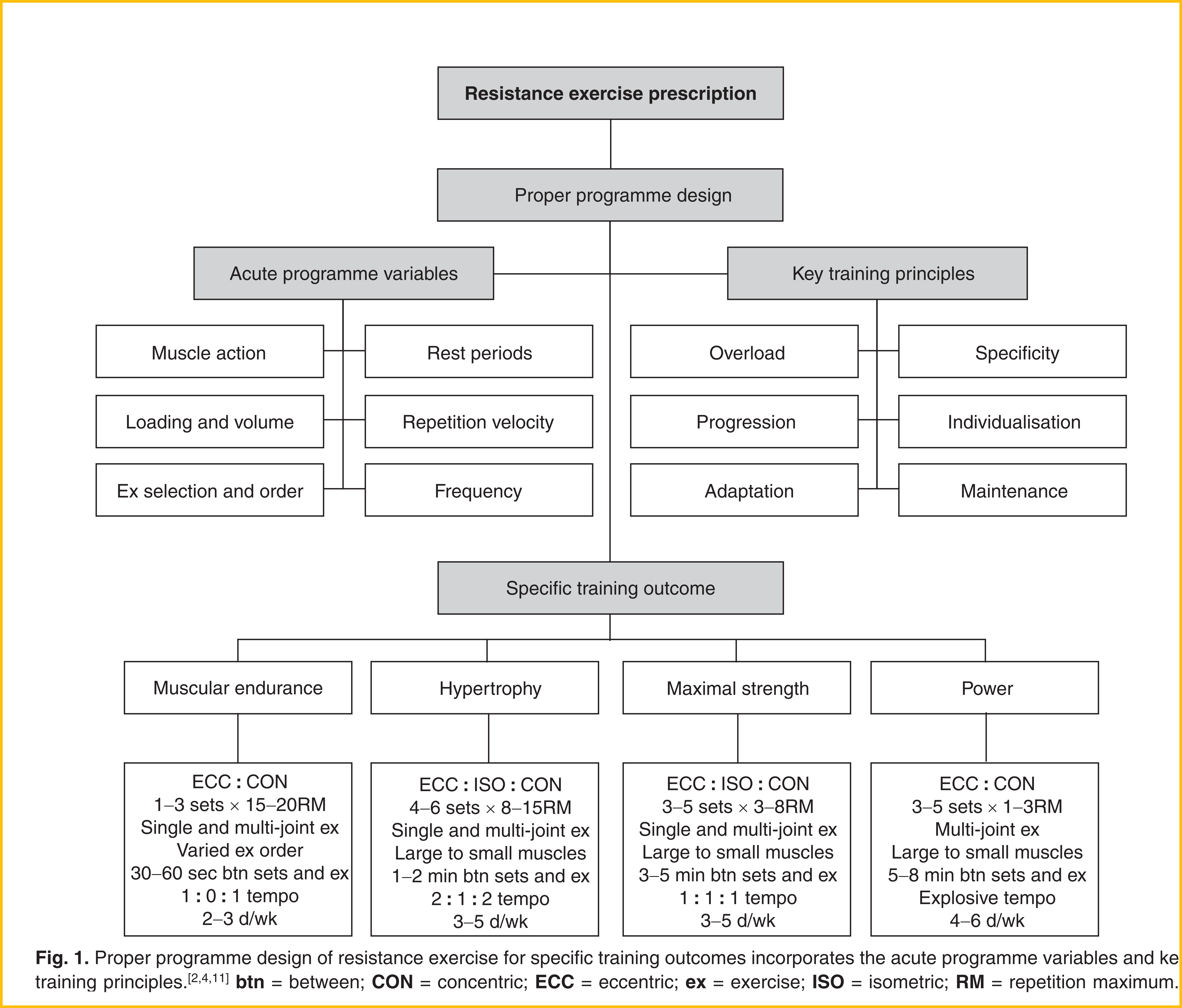 The effectiveness of a resistance training programme to achieve a specific training outcome (i.e. muscular endurance, hypertrophy, maximal strength, or power) depends on manipulation of the acute programme variables, these include: (i) muscle action; (ii) loading and volume; (iii) exercise selection and order; (iv) rest periods; (v) repetition velocity; and (vi) frequency (View Highlight)