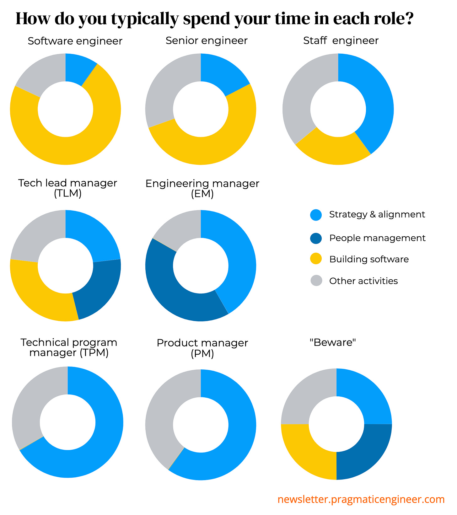 Strategy: little time. Senior engineers tend to contribute to the roadmap for the team, especially on the technical side. However, they rarely spend time on shaping the engineering strategy (View Highlight)