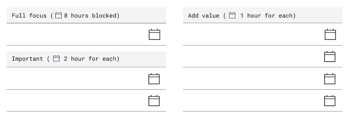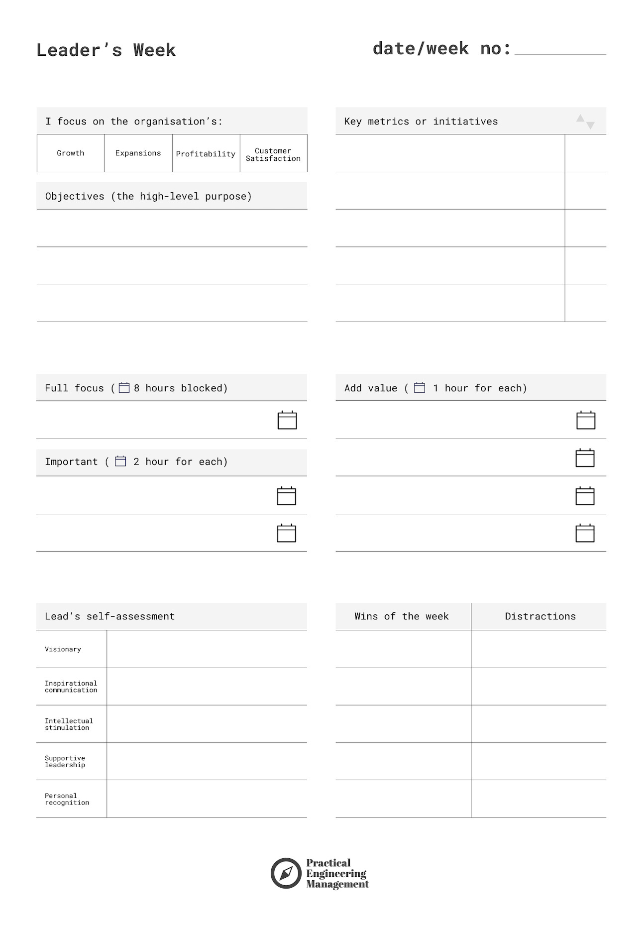 Although we live in a digital-first world, I highly encourage and recommend that you print out the Leader’s Week. Using pen and paper not only puts your tasks and goals to memory better, but it also takes away the biggest distractions. (View Highlight)